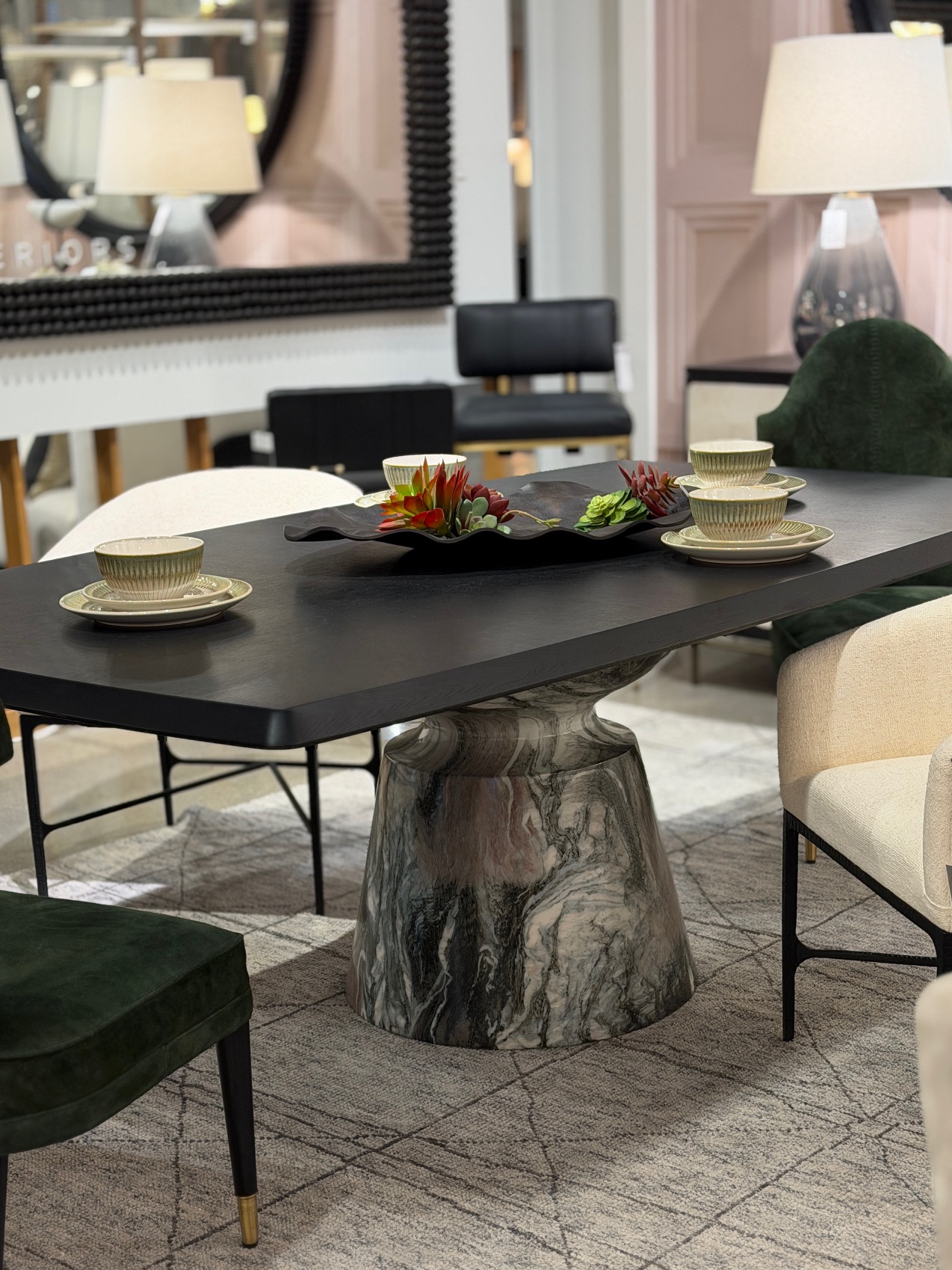 The ebonized wood top paired with a bold, sculptural stone base creates a striking mix of strength, polish, and natural drama.