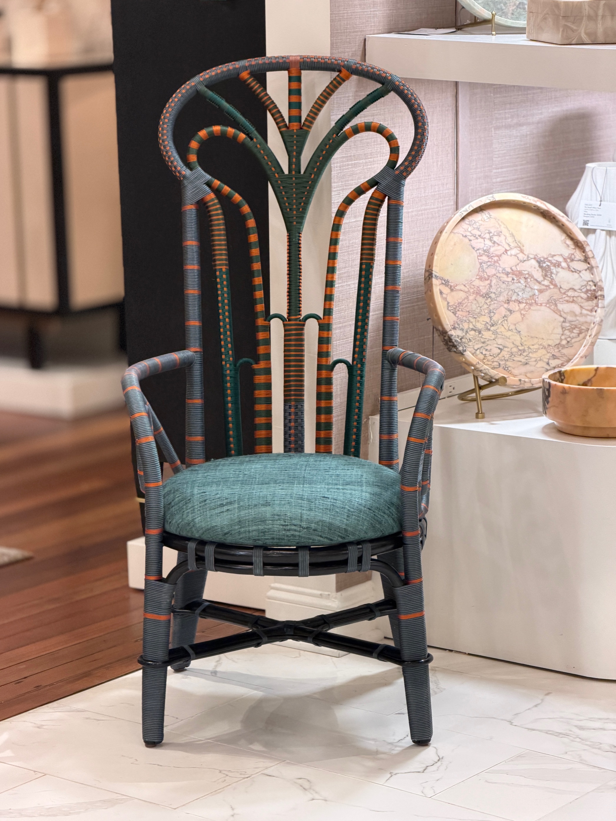 Woven raffia, cane, and heavily textured bouclé and velvet