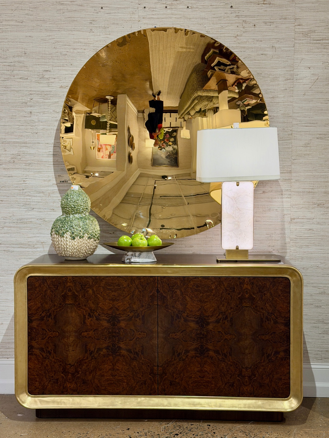 With its burl wood grain, brass trim, and sleek tailored design, this vignette channels the rich, polished vibe of a custom suit.
